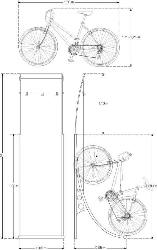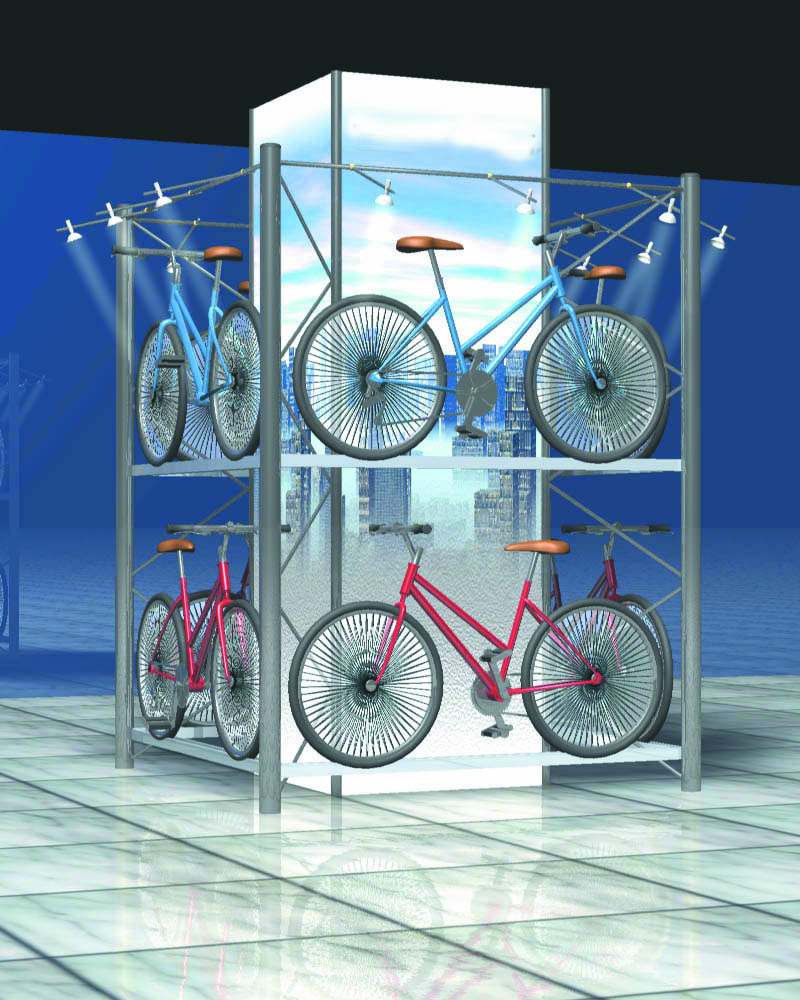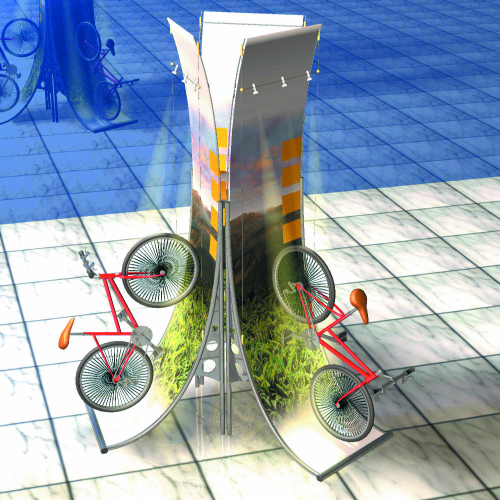 En 1999, j’ai réalisé à la demande de Renault-Sport, deux présentoirs permettant de vendre en concessions la nouvelle gamme de vélos. L’un permettant d’adapter la présentation selon l’espace disponible, en offrant la possibilité de créer des modules à 1, 2, 3, 4 ou 5 présentoirs. L’autre, davantage destinés aux concessions majeures disposant de grandes surfaces d’exposition, permet de présenter jusqu’à 8 vélos.